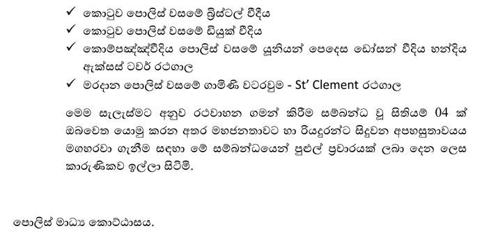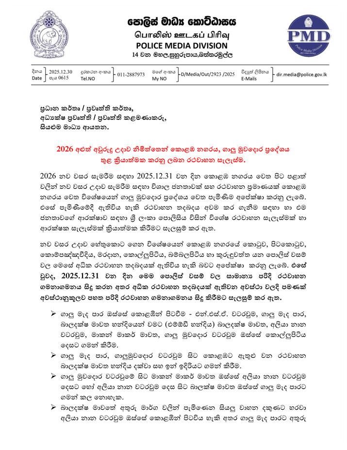 2026 නව වසර සැමරීම සඳහා හෙට (31දා) කොළඹ නගරය වෙත පිට පළාත්වනිල් විශාල ජනතාවක් හා රථවාහන ප්රමාණයක් කොළඹ නගරය වෙත විශේෂයෙන් ගාලු මුවදොර ප්ර දේශය වෙත පැමිණීම අපේක්ෂා කරන හෙයින් කොළඹ නගරය හා ගාලු මුවදොර ප්ර දේශය තුළ විශේෂ රථවාහන සැලැස්මක් ක්රියාත්මක බව පොලිස් මූලස්ථානය කියයි.