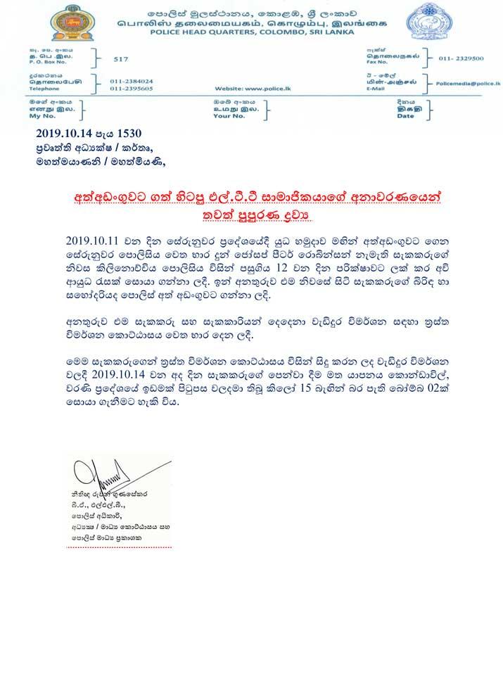 කිලිනොච්චියේදී අත්අඩංගුවට ගත් හිටපු එල්.ටී.ටී.ඊ. සාමාජිකයාගෙන් වැඩිදුර කළ ප්රශ්න කිරීම්වලට අනුව කිලෝ 15ක් බරැති පැති බෝම්බ දෙකක් සොයාගත් බව පොලීසිය පවසයි.