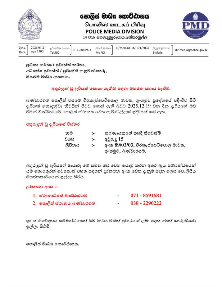 බණ්ඩාරගම, ගුංගමුව පදිංචිව සිටි අවුරුදු 15ක දැරිවියක් පසුගිය වසරේ දෙසැම්බර් 19 දින සිට අතුරුදන්ව ඇති බවට ඇයගේ මව විසින් පොලසිය පැමිණිල්ලක් ඉදිරිපත් කර තිබේ. දැරියගේ ඡායාරූපයක් මාධ්ය වෙත යොමුකරමින් පොලීසිය ඇය ගැන තොරතුරක් ඇත්නම් දන්වා සිටින්න යැයි ඉල්ලා සිටියි.
