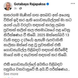 කතරගම මැණික් ගඟ අසබඩ ඇති ගොඩනැගිල්ලක් තමන්ට අයත් යැයි වරදවා සඳහන් කරමින් ප්රවෘත්තියක් විකාශය වන බවත් එම දේපළ තමන්ට අයිති නොමැති බවත් හිටපු ජනපති ගෝඨාභය රාජපක්ෂ මහතා සිය ෆේස්බුක් ගිණුමේ සටහනක් තබමින් පවසයි.