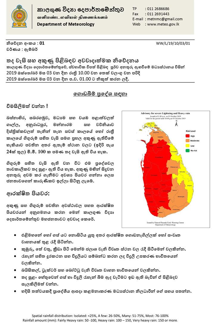 අද රාත්රී 10.00 තෙක් වලංගු වන පරිදි මෙම නිවේදනය නිකුත් කර තිබේ. බස්නාහිර, සබරගමුව, මධ්යම හා වයඹ පළාත්වලටත් ගාල්ල, අනුරාධපුර, මන්නාරම හා වව්නියාව යන දිස්ත්රික්කවලටත් අදළ වන පරිදි මෙම නිවේදනය නිකුත් කර තිබේ.