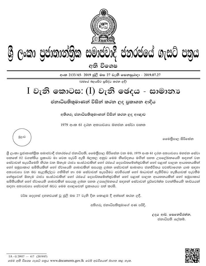 ජනපති මෛත්රීපාල සිරිසේන මහතාගේ උපදෙස් පරිදි ජනාධිපති ලේකම් උදය ආර්. සෙනෙවිරත්න මහතා විසින් මෙම අතිවිශේෂ ගැසට් නිවේදනය නිකුත් කර තිබේ.