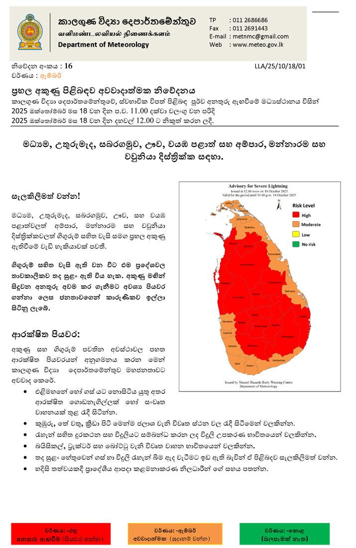 ප්රභල අකුණු පිළිබඳ අනතුරු ඇඟවීමේ නිවේදනයක් කාලගුණ විද්යා දෙපර්තමේන්තුව විසින් නිකුත් කර තිබේ.