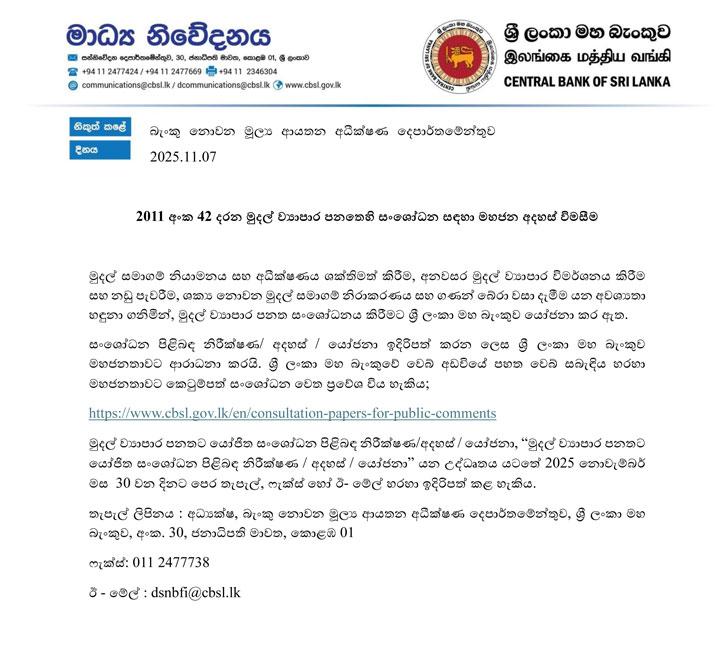 මුදල් සමාගම් නියාමනය සහ අධීක්ෂණය ශක්තිමත් කිරීම, අනවසර මුදල් ව්යාපාර විමර්ශනය කිරීම සහ නඩු පැවරීම, ශක්ය නොවන මුදල් සමාගම් නිරාකරණය සහ ගණන් බේරා වසා දැමීම යන අවශ්යතා හඳුනා ගනිමින්, මුදල් ව්යාපාර පනත සංශෝධනය කිරීමට ශ්රී ලංකා මහ බැංකුව යෝජනා කර ඇත. ඒ අනුව 2011 අංක 42 දරන මුදල් ව්යාපාර පනතෙහි සංශෝධන සඳහා මහජන අදහස් විමසීමට මහ බැංකුව තීරණය කර තිබේ.