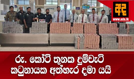 රුපියල් කෝටි තුනක් වටිනා විදේශීය නිෂ්පාදිත දුම්වැටි තොගයක් , කටුනායක ගුවන් තොටුපොළ රේගු නිලධාරීන් විසින් 03/27 දින දහවල් අත් අඩංගුවට ගෙන තිබේ. මෙම දුම්වැටි තොගය ඩුබායි සිට මෙරටට ගෙනැවිත් තිබූ අතර , ඒවා කටුනායක ගුවන් තොටුපොළ ගමන් මලු පථ තුළ අතහැර දමා තිබූ ගමන් මලු 13 ක් තුළ තිබියදී රේගු නිලධාරීන් විසින් අත් අඩංගුවට ගෙන තිබුණි. මෙසේ අත් අඩංගුවට ගත් විදේශීය නිෂ්පාදිත දුම්වැටි තොගය අතර " ප්ලැටිනම්'' සහ " මැන්චෙස්ටර් '' වර්ග වල දුම්වැටි 200,000 ක් අඩංගු දුම්වැටි කාටූන් 1,000 ක් තිබුණි. මෙම දුම්වැටි සියල්ල කටුනායක ගුවන් තොටුපොළ රේගු නිලධාරීන් විසින් රාජසන්තක කළ අතර , ඒවා කොළඹ රේගු ප්රධාන ගබඩා සංකීර්ණය වෙත යොමු කිරීමට පියවර ගෙන තිබේ .