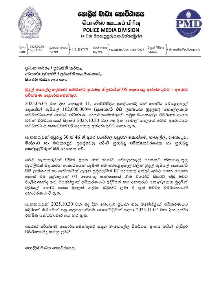 කොළඹ හෙට්ටිවීදියේ රන් භාණ්ඩ අලෙවිසැල් දෙකකින් රුපියල් දස කෝටි විසි ලක්ෂයක මුදලක් කොල්ලකෑමකට සම්බන්ධ