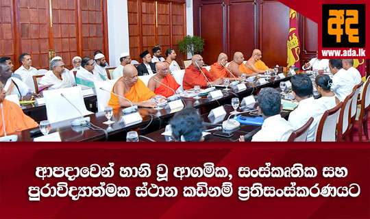 Read Moreදිට්වා සුළි කුණාටුවෙන් බලපෑමට ලක් වූ මෙරට ආගමික, සංස්කෘතික සහ පුරාවිද්යාත්මක ස්ථානවල සිදු කළ යුතු ප්රතිසංස්කරණ කටයුතු පිළිබඳ සාකච්ඡාවක් ත්රෛනිකායික මහා සංඝරත්නය සහ අනෙකුත් ආගමික නායකයන්ගේ සහභාගිත්වයෙන් බුද්ධශාසන, ආගමික සහ සංස්කෘතික කටයුතු අමාත්ය ආචාර්ය හින්දුම සුනිල් සෙනෙවි මහතාගේ ප්රධානත්වයෙන් ඊයේ (18) පස්වරුවේ ජනාධිපති කාර්යාලයේදී පැවැත්විණි.