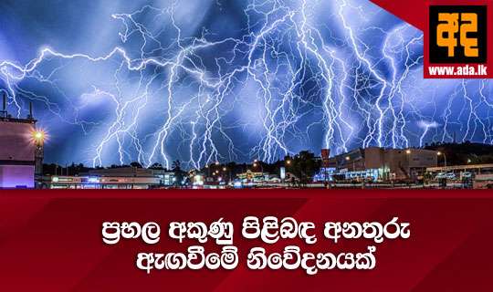 Read Moreප්රභල අකුණු පිළිබඳ අනතුරු ඇඟවීමේ නිවේදනයක් කාලගුණ විද්යා දෙපර්තමේන්තුව විසින් නිකුත් කර තිබේ. මධ්යම, උතුරු මැද, සබරගමුව, ඌව, වයඹ පළාත් හා අම්පාර, මන්නාරම හා වව්නියා දිස්ත්රික්වලට අදාළ වන පරිදි නිකුත් කර ඇති මෙම නිවේදනය හෙට දින දහවල් 11 තෙක් වලංගු වෙයි.