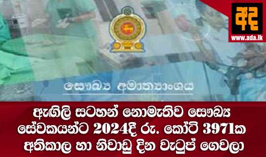 ඇගිලි සලකුණු යන්ත්ර මගින් සනාථ කරගැනිමකින් තොරව සෞඛ්ය අමාත්යංශය විසින් එහි සේවකයින් සදහා ඉකුත් වර්ෂයේ දි (2024) අතිකාල සහ නිවාඩු දින වැටුප් ලෙස රුපියල් තුන්දහස්නමසිය හැත්තෑඑක්කෝටි, හැත්තැහයලක්ෂ ,විසිහයදහස්, හයසියපහළොවක මුදලක් (39,717,626,615) ගෙවා ඇති බැව් ජාතික විගණන කාර්යාලය මගින් නිකුත්කොට ඇති නවතම වි