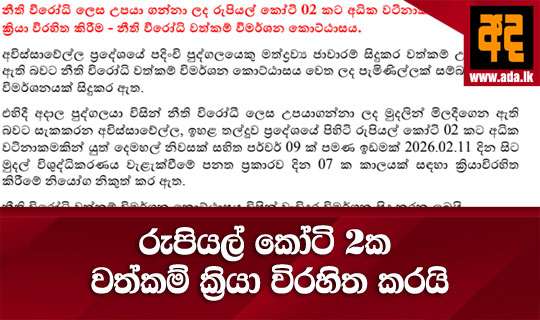 Read Moreඅවිස්සාවෙල්ල ප්ර දේශයේ පදිංචි පුද්ගලයෙකු මත්ද්රව්ය ජාවාරම් සිදුකර වත්කම් උපයාගෙන ඇති බවට නීති විරෝධී වත්කම් විමර්ශන කොට්ඨාසය වෙත ලද පැමිණිල්ලක් අනුව විමර්ශන කර අදාළ පුද්ගයාගේ රුපියල් කෝටි 2කට අධික වටිනාකමකින් යුත් වත්කම් ක්රියාවිරහිත කර ඇති බව පොලිසිය කියයි.