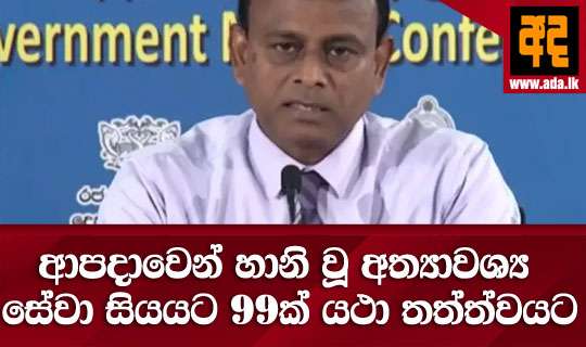 ආපදාවෙන් හානි වූ අත්යාවශ්ය සේවාවන් 99%ක් මේ වන විට සම්පූර්ණයෙන් යථා තත්ත්වයට පත් කර ඇති බව අත්යාවශ්ය සේවා කොමසාරිස් ජනරාල් ප්රභාත් චන්ද්රකීර්ති මහතා පැවසීය.