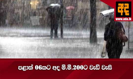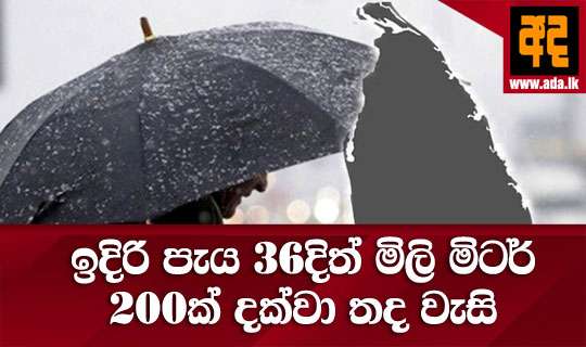 Read Moreඉදිරි පැය 36ක කාලය තුළ උතුරු, උතුරු මැද, මධ්යම හා වයඹ පළාත්වලටත් ත්රිකුණාමලය දිස්ත්රික්කයෙත් ඇතැම් ස්ථානවලට මිල මීටර් 200ක් තරම් වූ ඉතා තද වැසි ඇතිවිය හැකි බව කාලගුණ විද්යා දෙපාර්තමේන්තුව කියයි. මීට අමතරව සබරගමුව හා බස්නාහිර පළාත්වලට බදුල්ල, මඩකලපුව, දිස්ත්රිත්කක්වල ඇතැම් ස්ථානවලට මිලි මීටර් 150ක් දක්වා තද වැසි ඇතිවිය හැකි බවද කාලගුණ විද්යා දෙපාර්තමේන්තුව පවසයි. දිවයිනේ සෙසු ප්ර දේශවල ඇතැම් ස්ථානවලට මිලි මීටර් 100ක තද වැසි ඇතිවිය හැකි බවද