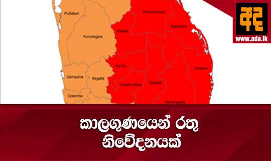 Read Moreතද වැසි ඳපිළිබ අවවාදාත්මක රතු නිවේදනයක් කාලගුණ විද්යා දෙපාර්තමේන්තුව විසින් නිකුත් කර තිබේ. අද පස්වරු 3.45ට නිකුත් කළ මෙම නිවේදනය හෙට පස්වරු 3.45 දක්වා වලංගු වෙයි. නැගෙනහිර, මධ්යම, ඌව පළාත් හා පොළොන්නරුව දිස්ත්රික්ක ඳසහා අදාළ වන පරිදි මෙම නිවේදනය නිකුත් කර තිබේ.