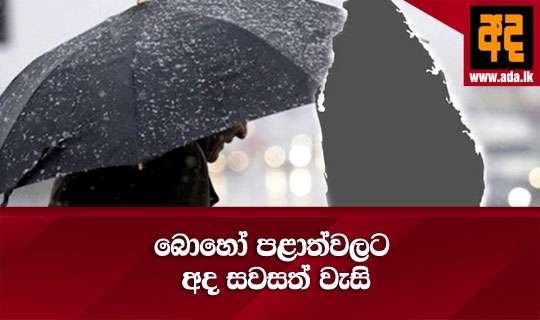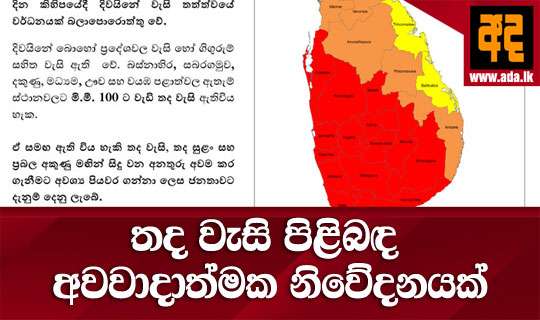 Read Moreතද වැසි පිළිබඳව කාලගුණ විද්යා දෙපාර්තමේන්තුව විසින් අවවාදාත්මක නිවේදනයක් නිකුත්කර තිබේ. අද පස්වරු 3.00ට නිකුත් කළ මෙම නිවේදනය හෙට දින පෙරවරු 8.30 තෙක් වලංගු වෙයි.