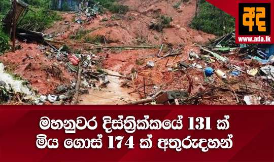 Read Moreදිවයින පුරා ඇති වූ අධික වැසි සහිත කාලගුණ තත්වය හේතුවෙන් අද 01 වනදා දක්වා මහනුවර දිස්ත්රික්කයේ පුද්ගලයින් 131 දෙනෙකු මිය ගොස් තවත් පුද්ගලයින් 174 දෙනෙකු අතුරුදහන් වී ඇති බව මහනුවර දිස්ත්රික් ආපදා කළමණාකරණ මධ්යස්ථානය පවසයි.