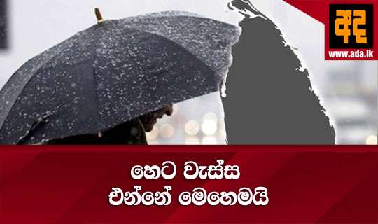 Read Moreහෙට දිනයේදී උතුරු, උතුරු-මැද, නැගෙනහිර පළාත්වලත් මාතලේ හා නුවරඑළිය දිසරික්කවලත් විටින් විට වැසි ඇතිවන බව කාලගුණ විද්යා දෙපාර්තමේන්තුව පවසයි.උතුරු, උතුරු මැද පළාත්වලත් ත්රීකුණාමලය දිස්ත්රික්කයේත් ඇතැම් සරථානවලට මිලිමීටර් 50ට වැඩි තරමක් තද වැසි ඇති විය හැකි බව එම දෙපාර්තමේන්තුව පවසයි.