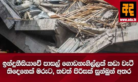 Read Moreඉන්දුනීසියාවේ පාසල් ගොඩනැගිල්ලක් කඩා වැටීමෙන් සිදුවූ අනතුරින් මේ වන විට පුද්ගලයන් 3 ක් මියගොස් ඇති බව ජාත්යන්තර මාධ්ය වාර්තා කරයි. මිය ගිය අය අතර එම පාසලට අලුතෙන් එක්වූ සිසුවෙක්ද සිටින බව ජාත්යන්තර මාධ්ය වාර්තා කරයි. සිසුන් හා කම්කරුවන් පිරිසක් සුන්බුන් අතර සිරවී ඇති අතර ඔවුන් බේරා ගැනීමට සහන කණ්ඩායම් කටයුතු කරමින් සිටියි.