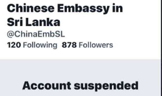 Read Moreශ්රී ලංකාවේ චීන තානාපති කාර්යාලයේ ට්විටර් ගිණුමට පිවිසිමේ අවස්ථාව ට්විටර් පාලනාධිකාරිය විසින් අවහිර කර තිබේ.