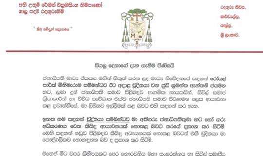 Read Moreරෝයල් පාක් චූදිතට ජනපති සමාව ලබාදීමේදි ගාලු පදවි රදගුරුහිමි වන අති උතුම් රේමන් වික්රමසිංහ හිමාපාණන් කළ ඉල්ලීම්ද සළකා බැලූ බව සඳහන් කරමින් ජනපති මාධ්ය අංශය නිකුත් කළ නිවේදනය ප්රතික්ෂේප කරන බව එම හිමිපාණෝ සඳහන් කරති.