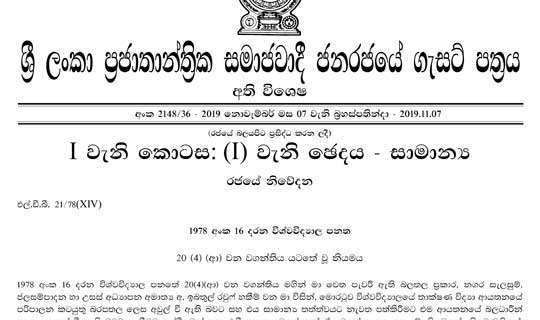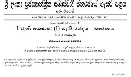Read Moreඑළැඹෙන නොවැම්බර් 11 දා පෙ.ව. 11.30ට පාර්ලිමේන්තුව කැඳවීමට අදාළ අති විශේෂ ගැසට් නිවේදනය කථානායක කරු ජයසූරිය මහතා නිකුත් කර තිබේ.