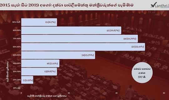 Read More2015 සැප්තැම්බර් සිට පසුගිය අගෝස්තු මාසය දක්වා පාර්ලිමේන්තුවේ පැවැති සභාවාර 387න් සියයට 90ට වැඩි ප්රමාණයකට සහභාගිවී ඇත්තේ මන්ත්රීවරු (6.7%) බව Manthri.lk වෙබ් අඩවිය පවසයි.