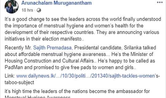 Read Moreකාන්තාවන්ගේ සනීපාරක්ෂක පහසුකම පිළිබඳව නව ප්රජාතන්ත්රවාදී පෙරමුණේ ජනාධිපති අපේක්ෂක සජිත් ප්රේමදාස මහතා කළ ප්රකාශය සම්බන්ධයෙන් ඉන්දියාවේ ප්රකට සමාජ ව්යවසාකයෙක් වන අරුනාචලම් මුරුගනාත්තම් මහතා ප්රසාදය පළ කර තිබේ.