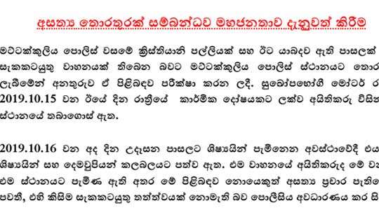 Read Moreමට්ටක්කුලිය ක්රිස්තියානි පල්ලියක් හා ඊට යාබදව ඇති පාසලක් අසළ නවතා තිබූ වාහනය සැක සහිත වාහනයක් නොව එය කාර්මික දෝෂයකට ලක්වීමෙන් අනතුරුව අයිතිකරු විසින් නවත්වා ගොස් ඇති එකක් බව පොලීසිය පවසයි.