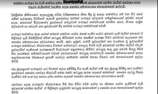 Read Moreදිස්ත්රික්ක කිහිපයකට ඇඳහැළුණු අධික වර්ෂාපතනය හේතුවෙන් ආපදා තත්ත්වයක් මේ වන විට පහව ගොස් තිබුණද ඇතැම් ප්රදේශවල තවමත් ගංවතුර අවදානම් සම්පුර්ණයෙන් පහව ගොස් නැති නිසා අනවශ්ය ලෙස වතුරට බැසිමෙන් වලකින ලෙස සෞඛ්ය අමාත්යාංශය නිවේදනයක් නිකුත් කරමින් අවධාරණය කරයි.