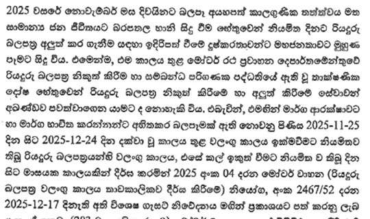 Read Moreදිත්වා සුළි කුණාටුව හේතුවෙන් නියමිත දිනට රියදුරු බලපත්ර අලුත් කර ගැනිම සඳහා ඉදිරිපත් විමේ දුෂ්කරතාවන්ටමුහුණ දුන් රියදුරන් වෙනුවෙන් රියදුරු බලපත්රවල වලංගු කාලය දීර්ඝ කිරීමට කැබිනට් අනුමැතිය ලැබී තිබේ.
