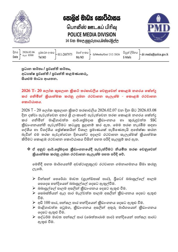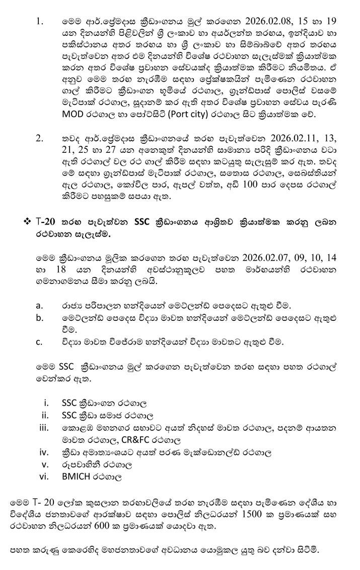 පන්දුවාර විස්සයි20 ලෝක කුසාලනයේ කොළඹ ආර්. ප්රේමදාස ක්රීඩාංගණයේ හා එස්.එස්.සී. පිටියේ පැවැත්වෙන තරග වෙනුවෙන් විශේෂ රථවාහන සැලැස්මක් ක්රියාත්මක බව පොලිස් මූලස්ථානය කියයි.