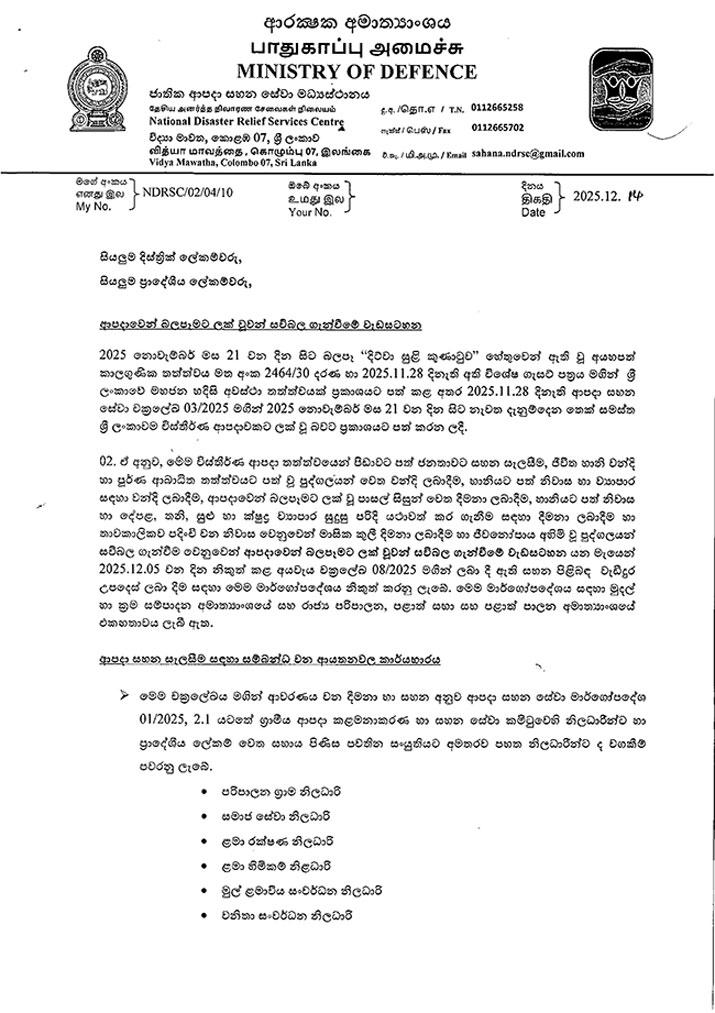 ආපදාවෙන් බලපෑමට ලක් වූවන් සවිබල ගැන්වීමේ වැඩසටහන ක්රියාත්මක කිරිම සම්බන්ධයෙන් නිකුත්කළ චක්රලේකයට අදාළ මාර්ගෝපදේශ මාලාව ආරක්ෂක අමාත්යාංශය මගින් නිකුත් කර තිබේ.