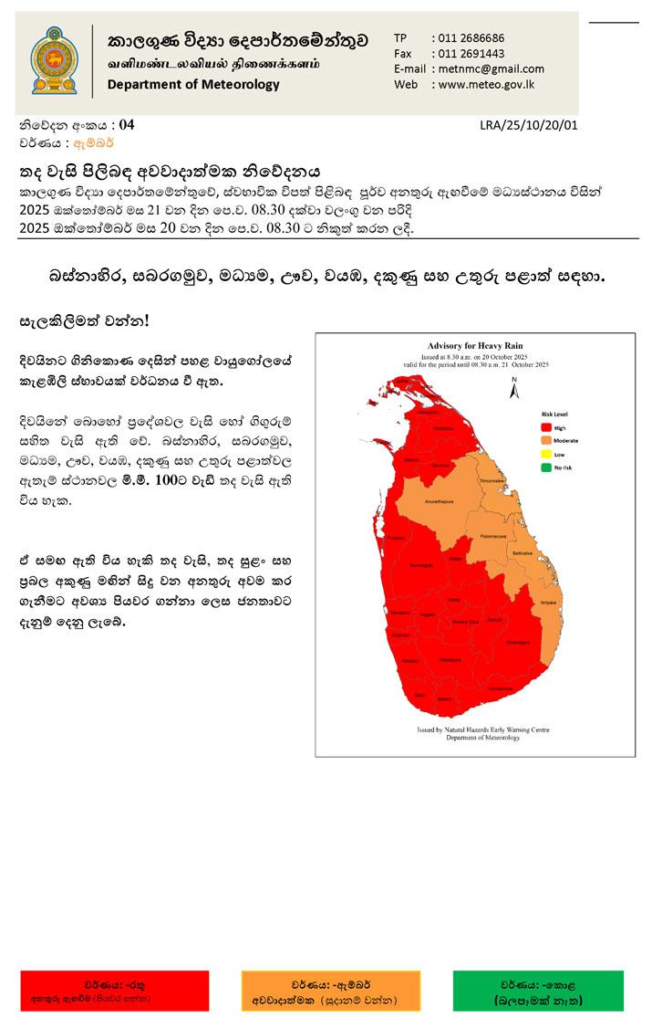 දිවයිනට ගිනිකොළ දෙසින් පහළ වායුගෝලයේ කැළඹිලි ස්වාභාවයක් වර්ධනය වී ඇති බව කාලගුණ විද්යා දෙපාර්තතමේන්තුව පවසයි. ඒ අනුව දිවයිනේ බොහෝ ප්ර දේශවල වැසි හෝ ගිගුරුම් සහිත වැසි ඇතිවන බව එම දෙපාර්තමේන්තුව නිකුත් කළ අවවාදාත්මක නිවේදනයක දැක්වෙයි.